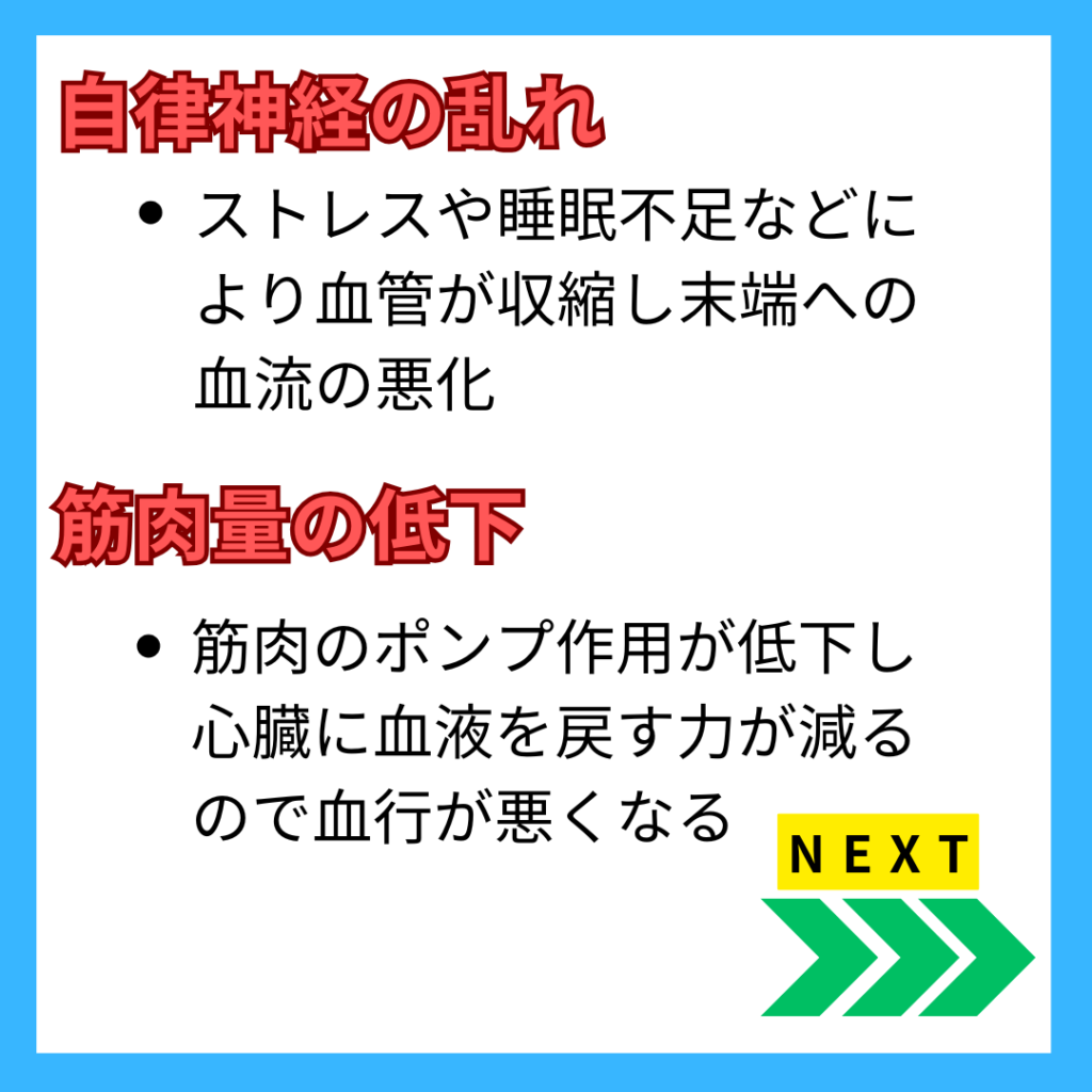 実は自律神経は血管収縮と拡張に関与していて乱れると末梢血管が収縮し血流が悪くなり冷え性になることがあります。