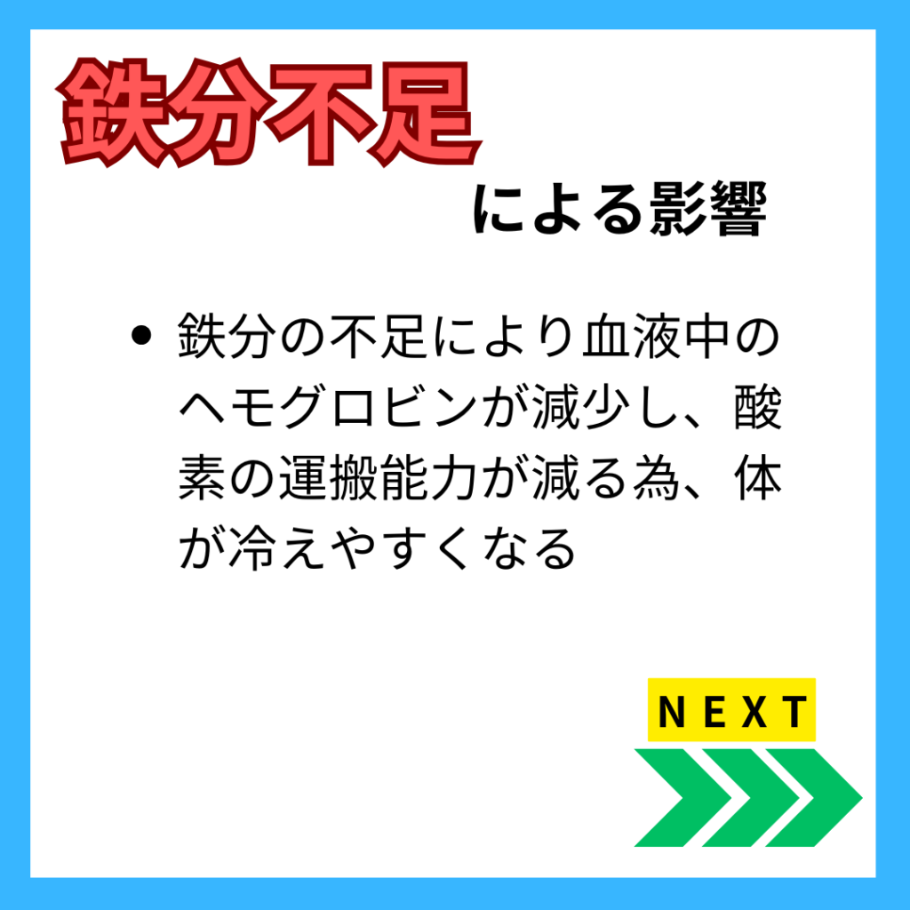 鉄分が不足すると血液中のヘモグロビンが減少し酸素を運搬する能力が減ります、その結果細胞がエネルギーを産生が低下し体温の維持が困難になります。