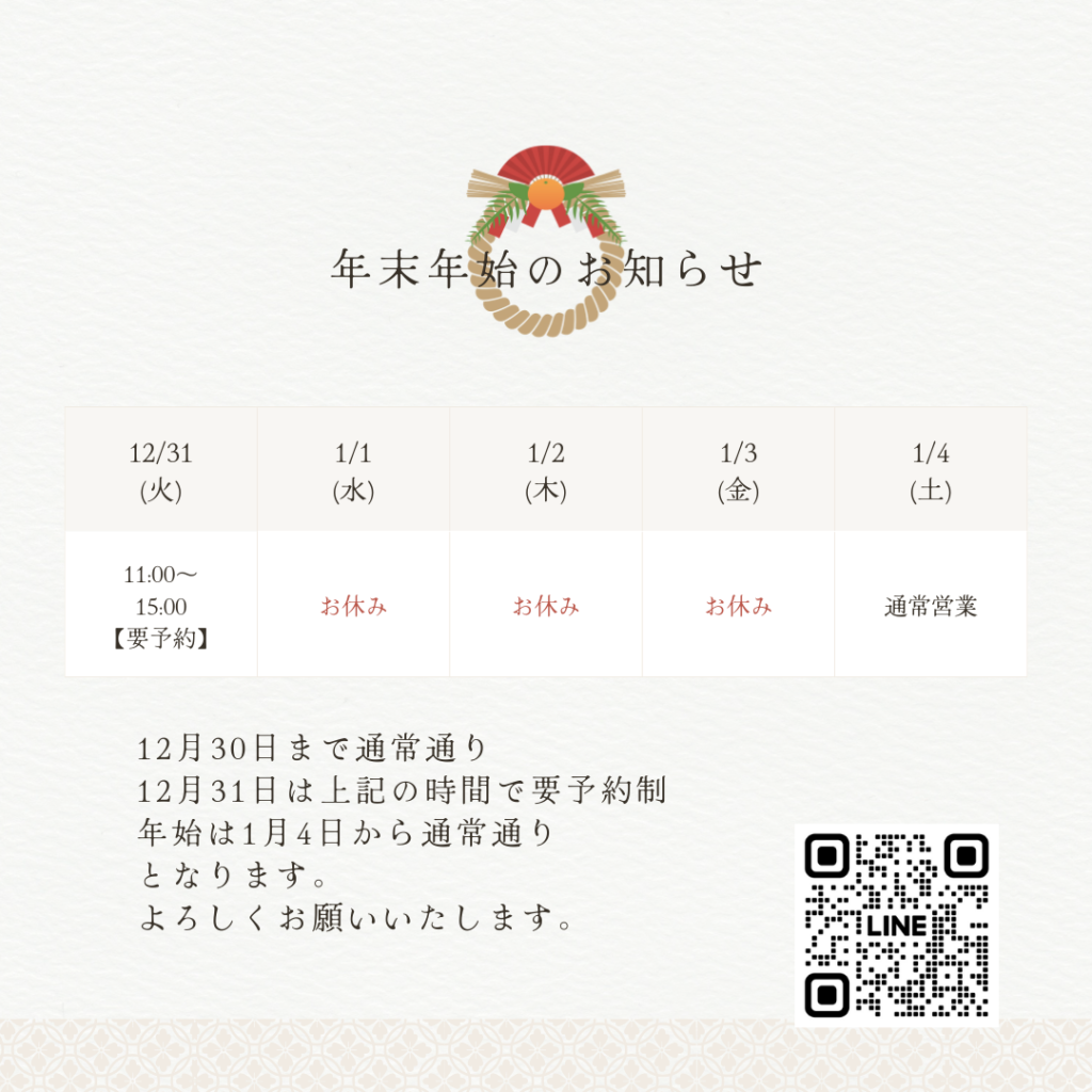 年末年始のお知らせです! 12月30日まで通常通り12月31日 11時~15時まで完全予約制 1月1日~3日までお休み1月4日から通常通り となります。 今年も残りわずかですが最後まで元気に過ごしましょう!!! お知らせ ケガ 接骨院 整体 整骨院 肩こり 腰痛 鍼灸 よかったらシェアしてね! URLをコピーしました! URLをコピーしました! 眼精疲労とケアの仕方 冷え性の原因 この記事を書いた人 院長 関連記事 GWのお知らせ 2025年4月25日 1月30日午後の受付 2025年1月30日 冷え性の原因 2025年1月24日 眼精疲労とケアの仕方 2024年11月27日 腰痛に効く鍼灸施術 その理由とは 2024年8月3日 腰痛に効く!?誰でも簡単にストレッチ PART1 2024年7月18日 梅雨にオススメツボ②選 2024年7月13日 年末年始のお知らせ 2023年12月20日 コメント コメントする コメントをキャンセルコメント ※ 名前 ※ メール ※ サイト 次回のコメントで使用するためブラウザーに自分の名前、メールアドレス、サイトを保存する。 上に表示された文字を入力してください。