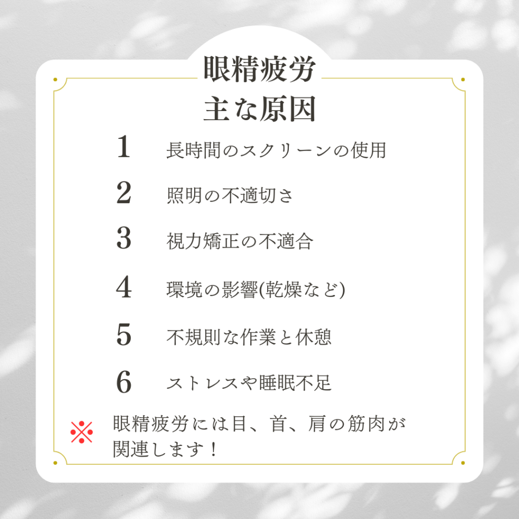 長時間休まずに目を使い続けると、目の筋肉が過労状態に陥ります。 定期的な休憩をとらないことも眼精疲労の大きな原因です。