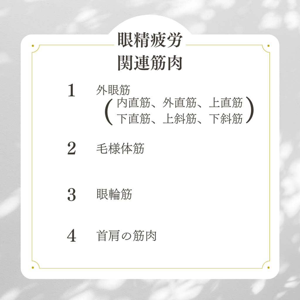 僧帽筋や肩甲挙筋、鎖乳突筋などの首や肩の筋肉も、長時間のデスクワークなどで緊張しやすく、血流が悪化すると眼精疲労が増します。