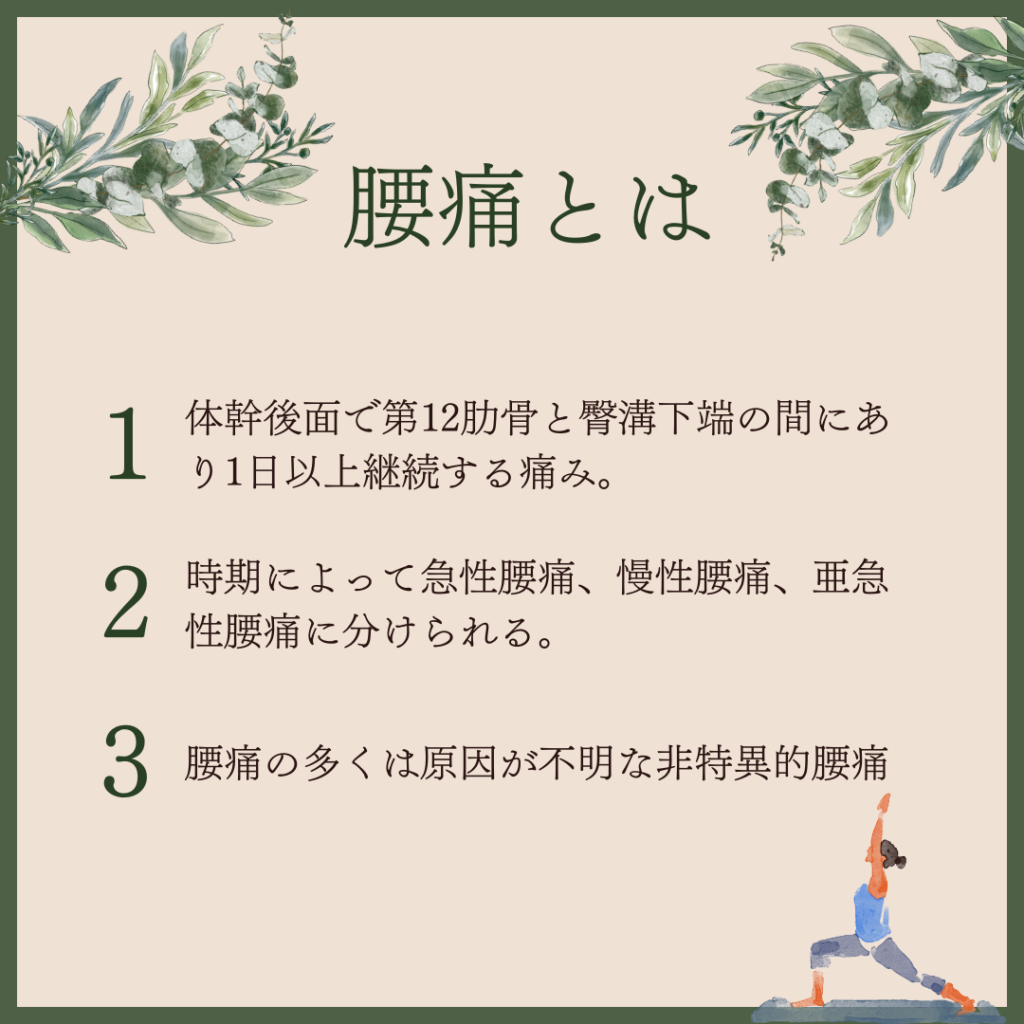 腰痛は体幹後面で第12肋骨と臀溝下端の間での1日以上継続する痛みであり