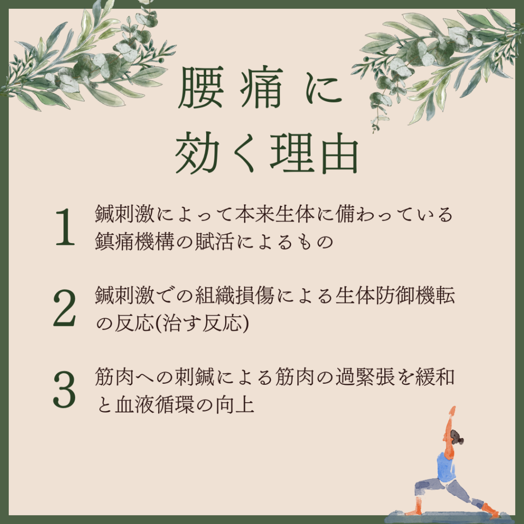 主にこの3つが鍼が腰痛に効く理由となります。